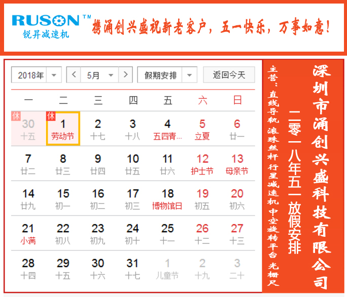 一、放假時(shí)間為2018年4月29日至2018年5月1日,共3天,于2018年5月2日正式上班。上班后,我公司的產(chǎn)品(直線導(dǎo)軌、滾珠絲桿、行星減速機(jī)、中空平臺(tái)、光柵尺)將正常供貨!