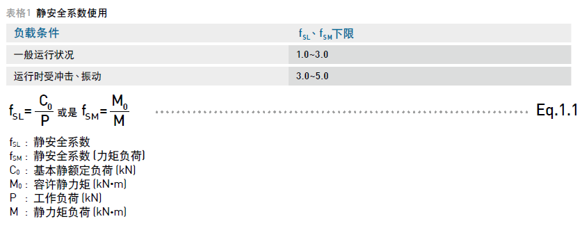當直線導(dǎo)軌使用在慢速運動或作動頻率不高的狀況下,需考慮靜安全系數(shù)。根據(jù)不同的使用狀況,計算靜負荷必