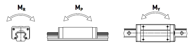 當滑塊中受到最大應(yīng)力的鋼珠達到上述定義之靜額定負荷時,此時滑塊所承載之力矩稱為靜額定力矩。在直線導(dǎo)軌運動中是以MR、MP、MY這三個方向來定義: