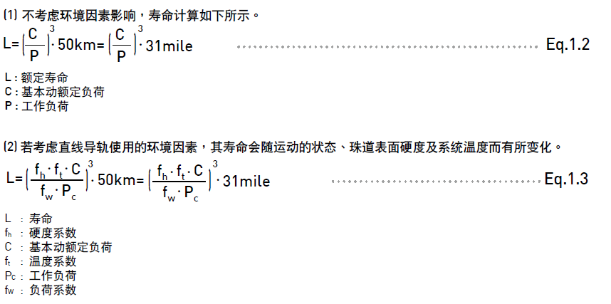 直線導(dǎo)軌的壽命會(huì)因?qū)嶋H承受工作負(fù)荷而不同,可依選用之直線導(dǎo)軌的基本動(dòng)額定負(fù)荷及工作負(fù)荷推算出使用壽命。