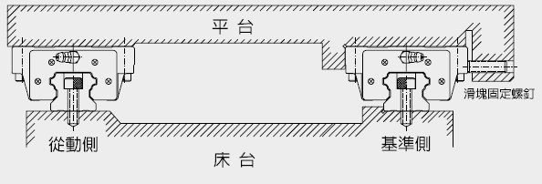將基準(zhǔn)側(cè)線軌的兩個(gè)滑塊及從動(dòng)側(cè)線軌其中一個(gè)滑塊固定于平臺(tái),再將從動(dòng)側(cè)的導(dǎo)軌及其另一個(gè)滑塊約略分別固定于床臺(tái)及平臺(tái),以基準(zhǔn)側(cè)導(dǎo)軌為準(zhǔn)移動(dòng)平臺(tái),從導(dǎo)軌一端開始,邊確認(rèn)從動(dòng)側(cè)直線導(dǎo)軌的滾動(dòng)阻力,邊依序以特定的扭力鎖緊裝配螺絲。