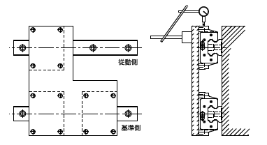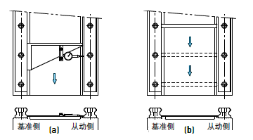 在無固定螺釘?shù)陌惭b例中為確保從動(dòng)側(cè)導(dǎo)軌與基準(zhǔn)側(cè)導(dǎo)軌間的平行度,導(dǎo)軌可依下列所示安裝,而滑塊的安裝則與前述范例相同。