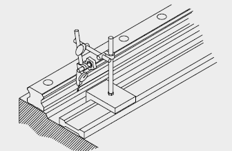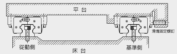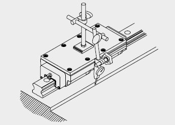 使用兩個滑塊緊密接合固定于測定用平板,依床臺導(dǎo)軌裝配附近的基準面為準,使用千分量表校準基準側(cè)導(dǎo)軌之側(cè)邊基準面,從導(dǎo)軌的一端開始校準并依序以特定的扭力鎖緊裝配螺絲。