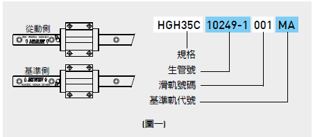 2. 確認基準軌與從動軌:當非互換型直線導(dǎo)軌配對使用時,需注意基準軌與從動軌之差異。基準軌側(cè)邊基準面精度較從動軌高,可作為床臺安裝承靠面?;鶞受壣嫌锌躺螹A之記號。而且,雙軌配對使用時,基準軌編號為奇數(shù),而從動軌之導(dǎo)軌編號為偶數(shù),安裝時請依照符號的指示,按順序進行安裝(例如:001與002配對、003與004配對…),如圖一所示。如為多軌安裝,請以此類推。
