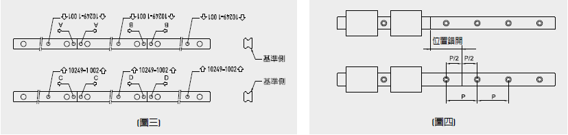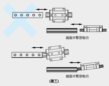 4. 導(dǎo)軌接牙件:導(dǎo)軌接牙安裝時必須依照導(dǎo)軌上標示順序安裝,以確保直線導(dǎo)軌精度。接牙標幟在接牙端的上表面,請將相同接牙標幟的兩端接在一起,如圖三所示。且建議配對之導(dǎo)軌接牙位置最好能錯開,以避免床臺至接牙處因不同導(dǎo)軌差異而造成精度不良,如圖四所示。
