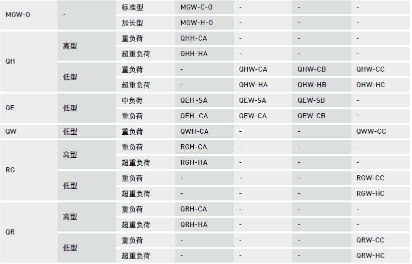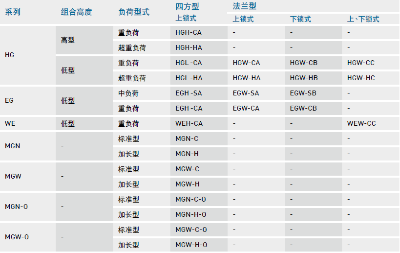 為服務(wù)客戶因應(yīng)其對(duì)產(chǎn)品多樣性的需求,除了適用一般工具機(jī)產(chǎn)業(yè)的HG系列外,更研究開(kāi)發(fā)出較適合自動(dòng)化產(chǎn)業(yè)的EG系列以及適合于單軸設(shè)備使用的WE/QW系列;且研究開(kāi)發(fā)出適合高剛性需求產(chǎn)業(yè)的RG/QR系列及微小型機(jī)械半導(dǎo)體產(chǎn)業(yè)適用之MGN/MGW系列;并針對(duì)高科技產(chǎn)業(yè)研究開(kāi)發(fā)出具有高速、寧?kù)o、低發(fā)塵需求的QH/QE系列產(chǎn)品。