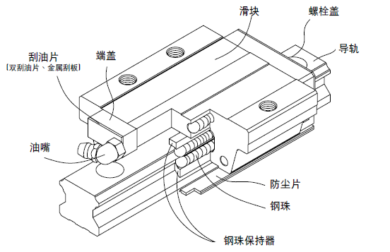 滾動(dòng)循環(huán)系統(tǒng):滑塊、導(dǎo)軌、端蓋、鋼珠、鋼珠保持器