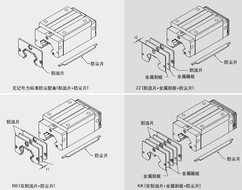 HIWIN特別針對(duì)具有粉塵顆粒之嚴(yán)苛作業(yè)環(huán)境,如木工機(jī)械、玻璃/石墨加工等設(shè)備,開(kāi)發(fā)具有超高防塵功能之特殊配件,實(shí)現(xiàn)超高防塵性能。若有下列高防塵配件需求時(shí),請(qǐng)于產(chǎn)品型號(hào)后面加注代碼。