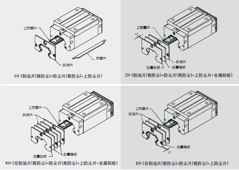 HIWIN針對(duì)較一般環(huán)境嚴(yán)苛之作業(yè)環(huán)境,開(kāi)發(fā)強(qiáng)化高防塵功能之防塵配件,若有下列高防塵配件需求時(shí),請(qǐng)于產(chǎn)品型號(hào)后面加注代碼。