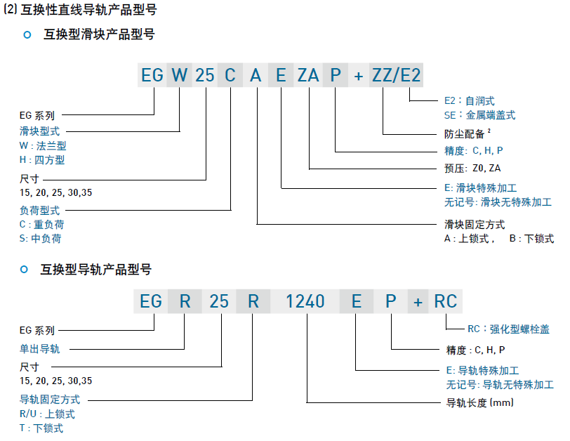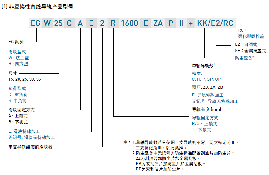 EG系列分為非互換性及互換性型兩種直線導軌,兩者規(guī)格尺寸相同,主要差異點在于互換性型之滑塊、導軌可單獨互換使用,較便利,但其組合精度無法達到非互換性型之超精密級以上的精度,不過由于HIWIN互換性型之組合精度目前已達到一定的水平,對不需配對安裝直線導軌的客戶而言,是一項便利的選擇。直線導軌的產(chǎn)品規(guī)格型號主要標明直線導軌尺寸、型式、精度等級、預壓等規(guī)格要求,以利訂貨時雙方對產(chǎn)品的確認。