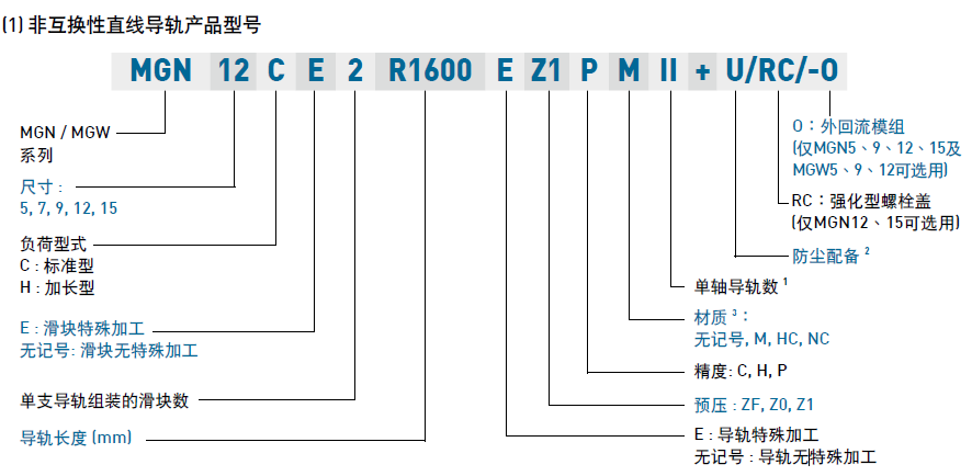 (1) 非互換性直線導(dǎo)軌產(chǎn)品型號(hào)