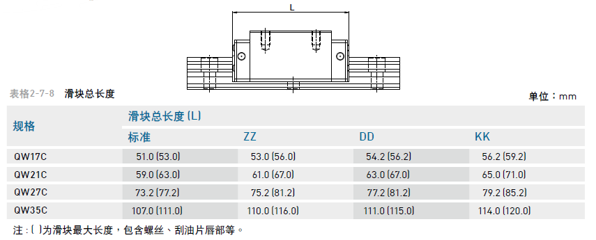 3、 防塵代碼之滑塊總長度及規(guī)格對照表,請訂直線導(dǎo)軌的時候一定要確認清林,以便出錯